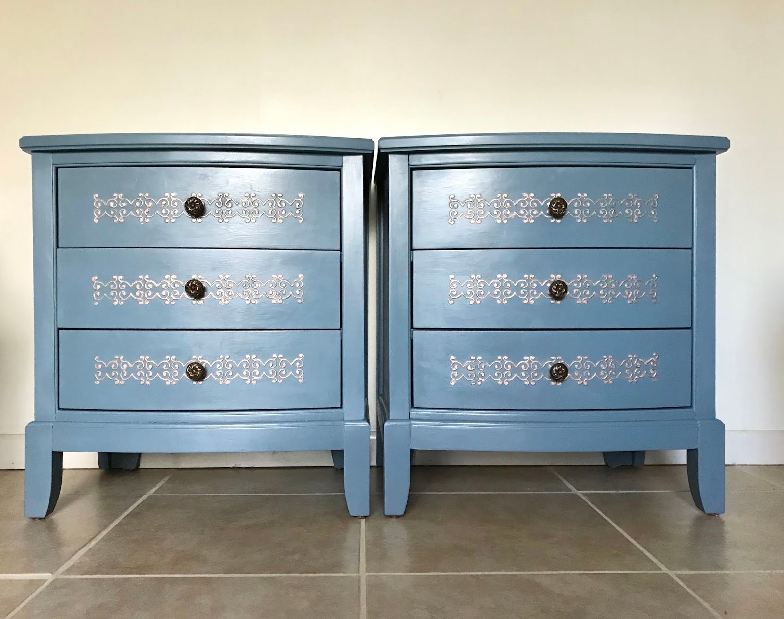 Pair of Three Drawer Night Stands - Danube Blue with Raised Stencil Nightstands